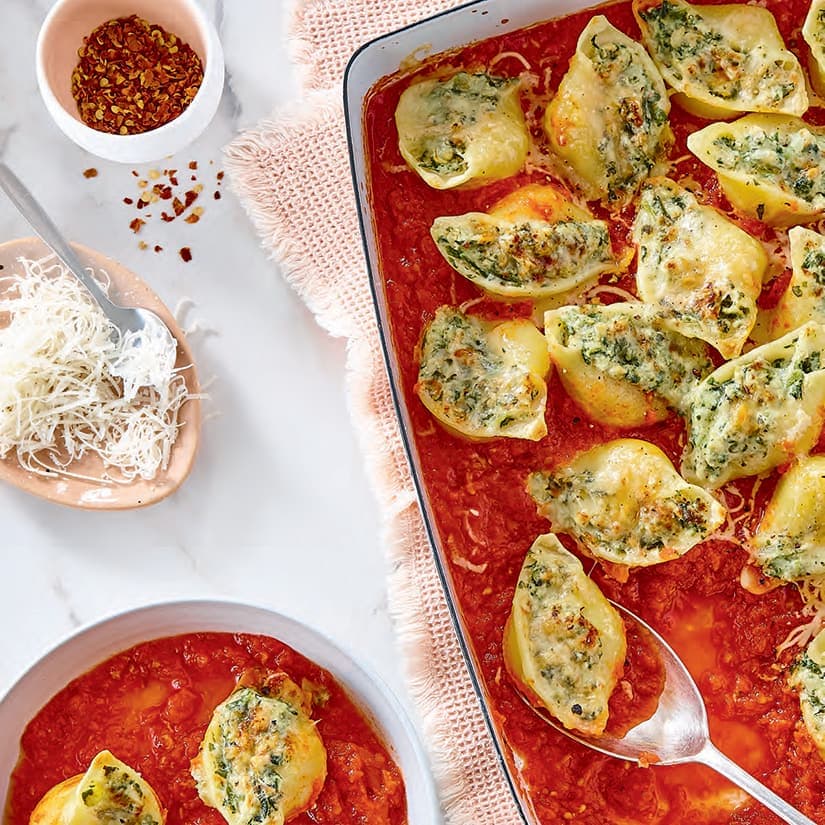 - Verser la sauce tomate dans un plat de cuisson de 11 x 7 po (28 x 18 cm). Garnir chaque coquille réservée d'environ 2 c. à soupe (30 ml) de la garniture aux épinards et aux artichauts. Déposer les coquilles côte à côte sur la sauce dans le plat. Parsemer du reste du parmesan. (Les coquilles farcies se conserveront jusqu'à 3 jours au réfrigérateur, le plat couvert d'une pellicule plastique, ou jusqu'à 1 mois au congélateur.)