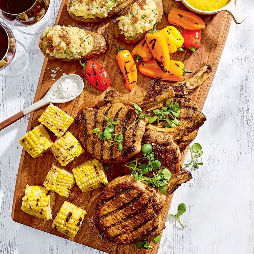- Au moment de servir, déposer les côtelettes grillées sur une grande planche de service. Ajouter les pommes de terre farcies et la sauce aux mangues grillées. Garnir la planche de minipoivrons et de maïs grillés, de verdures et de fleur de sel, si désiré.