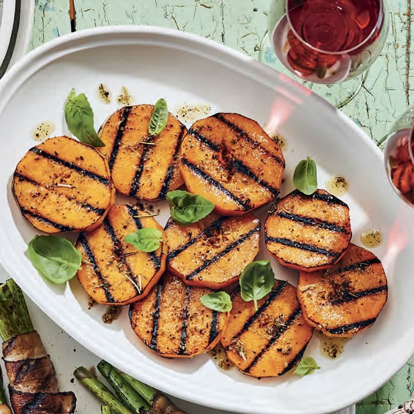 - 2. Dans un petit bol, mélanger l'huile et les herbes. Saler et poivrer. Badigeonner les tranches de courge de cette huile. Déposer les tranches sur la grille et cuire, de chaque côté, de 6 à 8 minutes ou jusqu'à ce que la courge soit tendre et bien dorée. Garnir d'herbes fraîches au goût.
