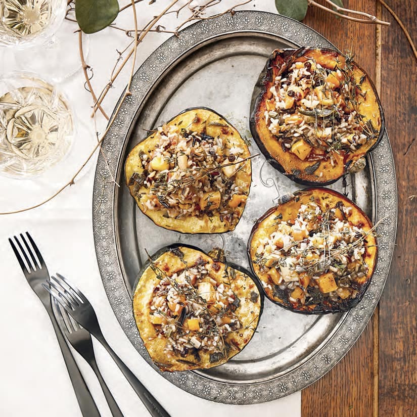 Un délicieux plat de courges rôties farcies d’un mélange parfumé de riz sauvage, fines herbes, fruits secs et pommes, relevé d’un soupçon de sirop d’érable. Un plat végétarien gourmand et réconfortant, parfait pour les repas festifs.