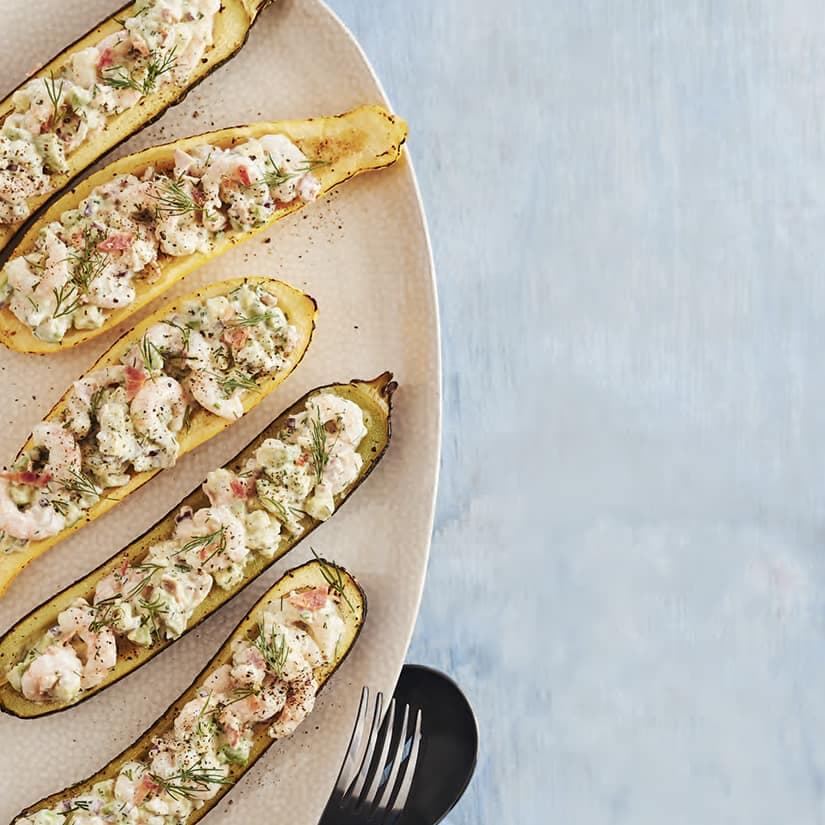 - Pendant ce temps, mélanger délicatement le reste des ingrédients dans un bol. Farcir les courgettes de la préparation de crevettes. Servir garni d'aneth frais.