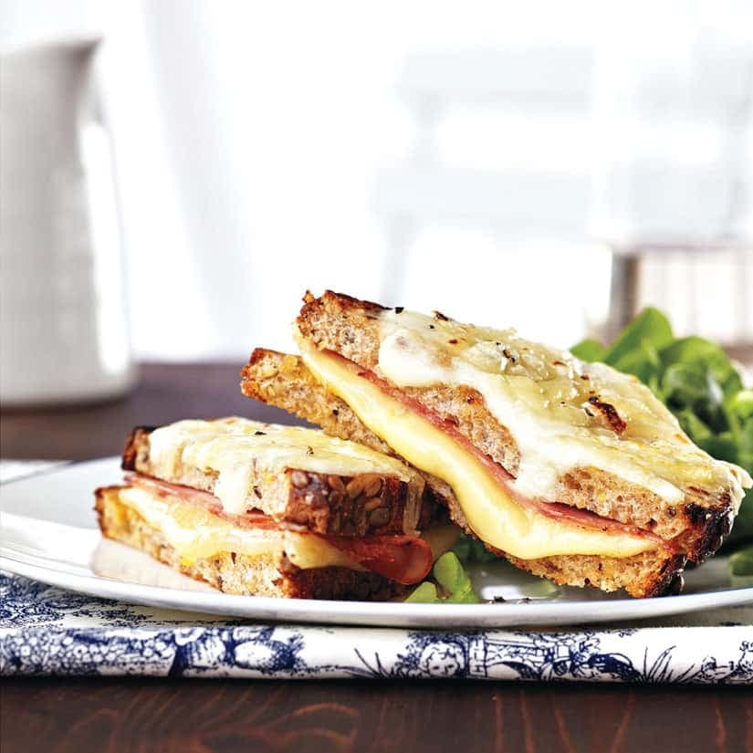 1. Verser la béchamel réservée sur les sandwichs dans le poêlon (ne pas la laisser couler sur les côtés des sandwichs). Parsemer du gruyère râpé. Cuire sous le gril préchauffé du four de 2 à 4 minutes ou jusqu'à ce que le fromage ait fondu et soit légèrement doré.