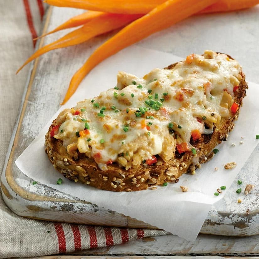 2. Tartiner le mélange sur le pain grillé et parsemer de fromage.