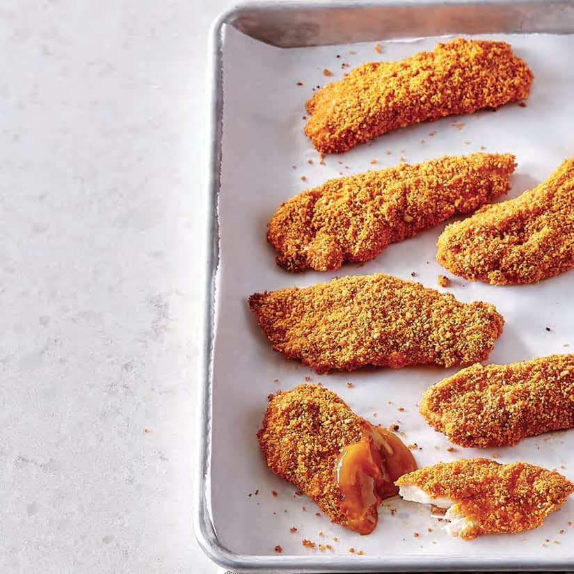 1. Au robot culinaire, en actionnant et en arrêtant l'appareil, moudre grossièrement les noix de cajou avec la chapelure, le paprika, les poudres d'ail et d'oignon, le sel, le poivre et le piment de Cayenne. Mettre le mélange dans un plat peu profond. Dans un autre plat, battre les œufs. Tremper les lanières de poulet dans les œufs battus, en laissant s'égoutter l'excédent, puis les passer dans le mélange de noix, en les retournant pour bien les enrober. Mettre les lanières de poulet sur une plaque de cuisson tapissée de papier parchemin. Vaporiser légèrement d'huile.