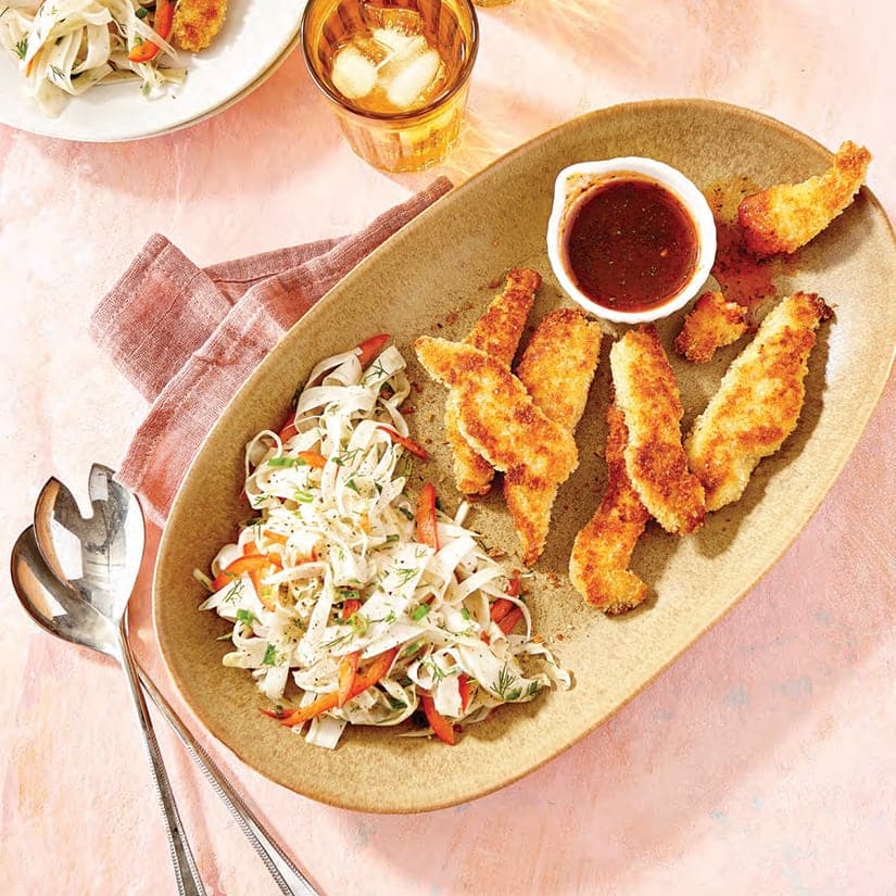 - Dans un grand poêlon, chauffer la moitié de l'huile à feu moyen-vif. Ajouter la moitié des tranches de poulet et cuire 6 minutes ou jusqu'à ce qu'elles soient dorées de chaque côté. Mettre le poulet sur une grande plaque de cuisson tapissée de papier parchemin. Dans le poêlon, cuire le reste du poulet avec le reste de l'huile de la même manière, puis le mettre sur la plaque. Poursuivre la cuisson au four préchauffé à 350 °F (180 °C) de 5 à 7 minutes ou jusqu'à ce que le poulet ait perdu sa teinte rosée à l'intérieur. Servir le poulet avec la sauce au miel et au poivron et la salade de fenouil.