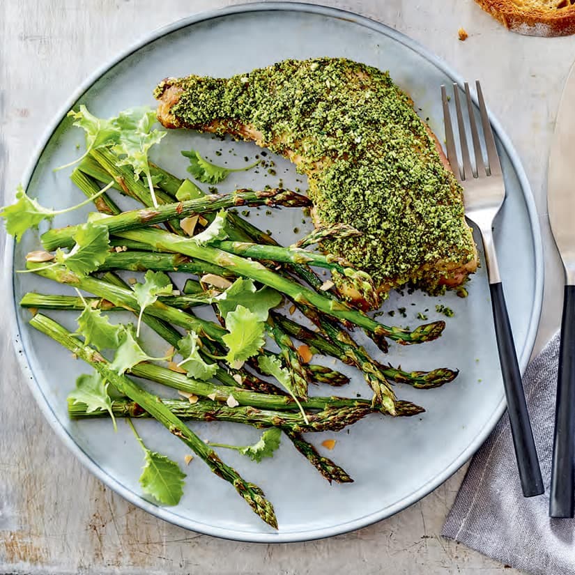 - Sur une plaque de cuisson tapissée de papier parchemin, déposer les cuisses de poulet égouttées. À l'aide d'une cuillère, couvrir uniformément le poulet du mélange aux herbes en pressant pour le faire adhérer, puis déposer une feuille d'aluminium par-dessus. Cuire au centre du four préchauffé à 375 °F (190 °C) pendant 30 minutes. Retirer le papier d'aluminium et poursuivre la cuisson 30 minutes ou jusqu'à ce que le jus qui s'écoule du poulet lorsqu'on le pique avec une fourchette soit clair. Servir les cuisses en croûte d'herbes accompagnées des asperges aux amandes.