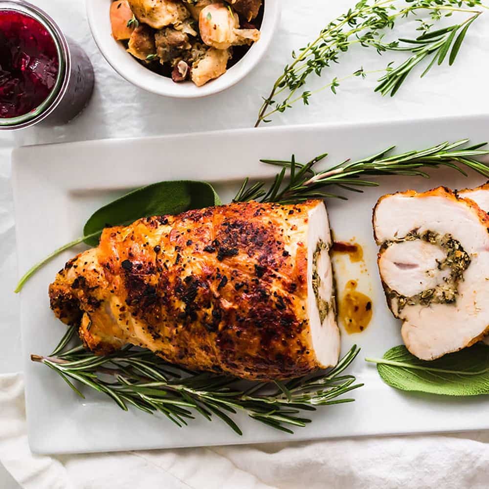 Dindon rôti, façon porchetta, avec sauce aux canneberges