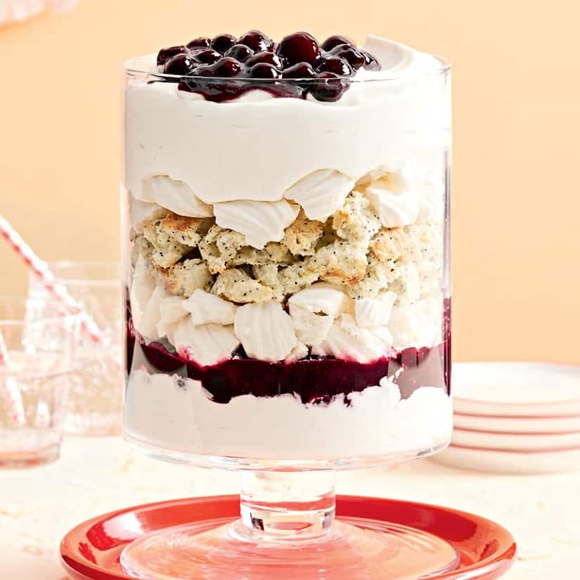 2. Casser les meringues en bouchées. Couvrir le fond d'un bol à diplomate d'une capacité de 12 t (3 L) de la moitié de la crème fouettée. Couvrir de la moitié de la compote de bleuets refroidie, puis de la moitié des morceaux de meringues. Couvrir successivement des morceaux de biscuits, du reste des meringues et du reste de la crème fouettée. Terminer avec le reste de la compote de bleuets. Couvrir le bol de pellicule plastique et réfrigérer 12 heures. (Le diplomate se conservera jusqu'au lendemain au réfrigérateur.) Laisser reposer 30 minutes à la température ambiante avant de servir.