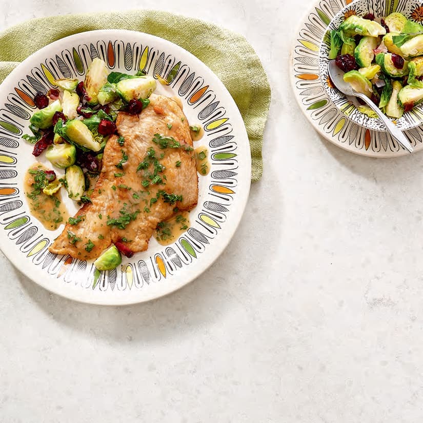 - À l'aide d'une écumoire, retirer les choux du poêlon. Ajouter le vinaigre, le persil et le beurre, et mélanger. Répartir les escalopes de dinde réservées et les choux de Bruxelles dans des assiettes. Arroser les escalopes de la sauce au persil.