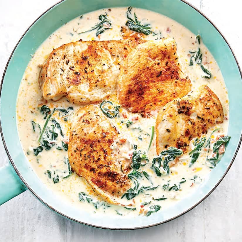 - Dans le poêlon, chauffer le reste de l'huile à feu moyen. Ajouter l'ail, l'échalote et les tomates séchées, puis cuire 1 minute en brassant. Verser le vin blanc et poursuivre la cuisson 2 minutes, en raclant le fond du poêlon pour en détacher les particules. Ajouter les épinards et cuire, en brassant de temps à autre, 3 minutes ou jusqu'à ce que les épinards aient ramolli. Saler et poivrer. Verser la crème et poursuivre la cuisson 2 minutes. Ajouter le parmesan et mélanger. Remettre le poulet dans le poêlon et réchauffer 1 minute. Servir le poulet aux épinards et aux tomates séchées avec des pâtes, si désiré.