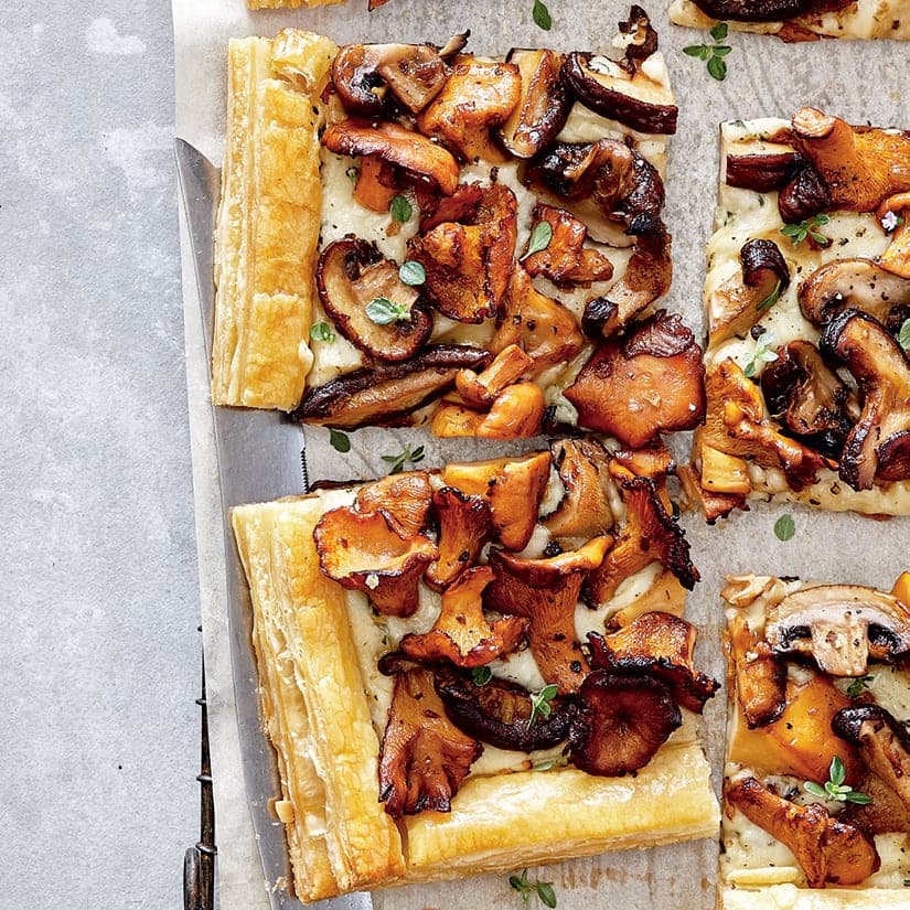 - Étendre la sauce sur la croûte feuilletée réservée. Parsemer du fromage et garnir des champignons réservés.