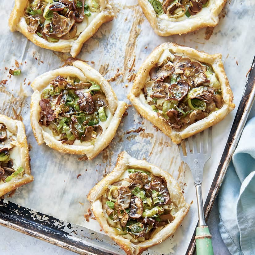 - Préchauffer le four à 425 °F (220 °C). Tapisser une plaque de cuisson de papier parchemin. Déposer les disques de pâte feuilletée sur la plaque en les espaçant d'au moins 2 po (5 cm). Réserver.