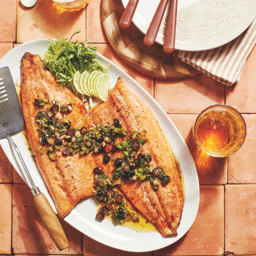- Déposer les filets de truite sur la grille, côté peau vers le bas. Fermer le couvercle et cuire de 5 à 6 minutes (ou jusqu'à ce que le poisson soit complètement opaque), sans les retourner. À l'aide d'une spatule large, retirer les filets du barbecue et les déposer dans une grande assiette de service. Servir arrosé de la vinaigrette, garni de verdures ou de micropousses, et accompagné de