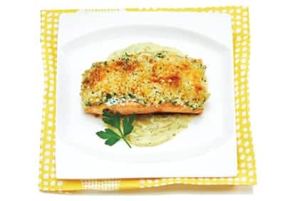 1. Dans un bol, mélanger le yogourt, la mayonnaise, les oignons verts et la coriandre. Mettre les filets de saumon sur une plaque de cuisson tapissée de papier d'aluminium, légèrement huilé, et les parsemer du sel et du poivre. Étendre uniformément le mélange de yogourt sur les filets de saumon. Dans un petit bol, mélanger la chapelure et le beurre. Parsemer les filets de saumon de ce mélange et presser légèrement pour le faire adhérer. Cuire au four préchauffé à 425˚F (220˚C) pendant environ 10 minutes ou jusqu'à ce que la chair du saumon se défasse facilement à la fourchette et que la chapelure soit dorée.