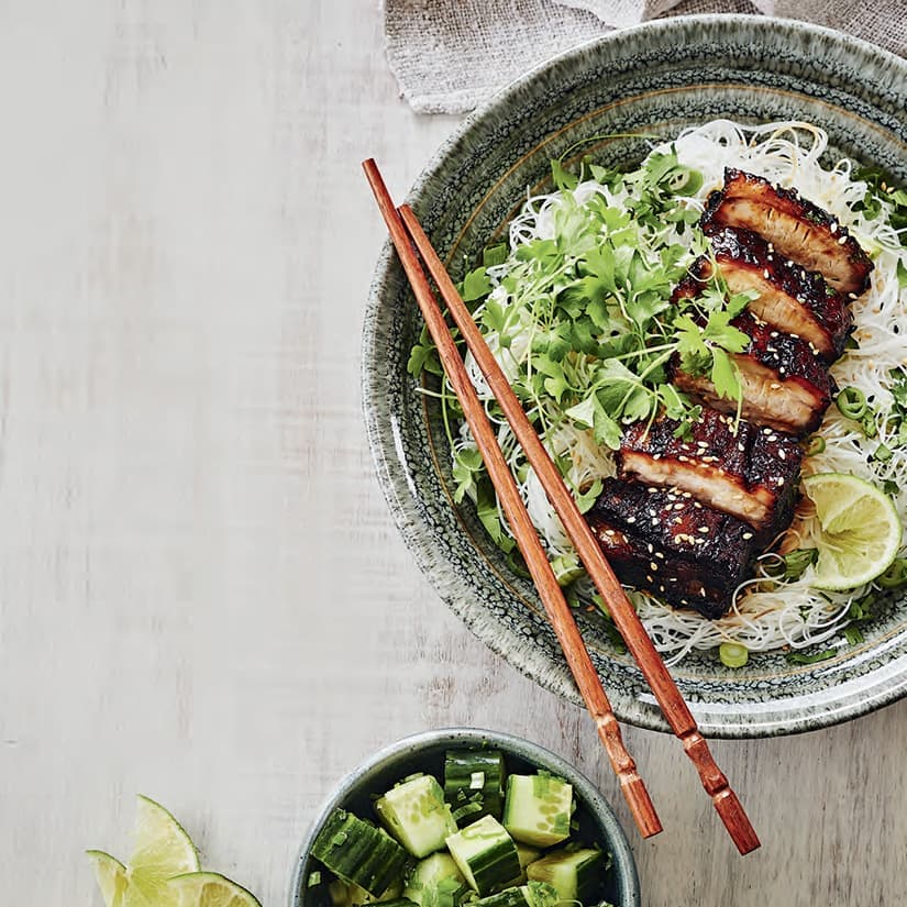 - Trancher la viande et servir sur des vermicelles de riz avec le jus de cuisson, le tout garni de coriandre, d'oignon vert, de quartiers de lime et de graines de sésame.
