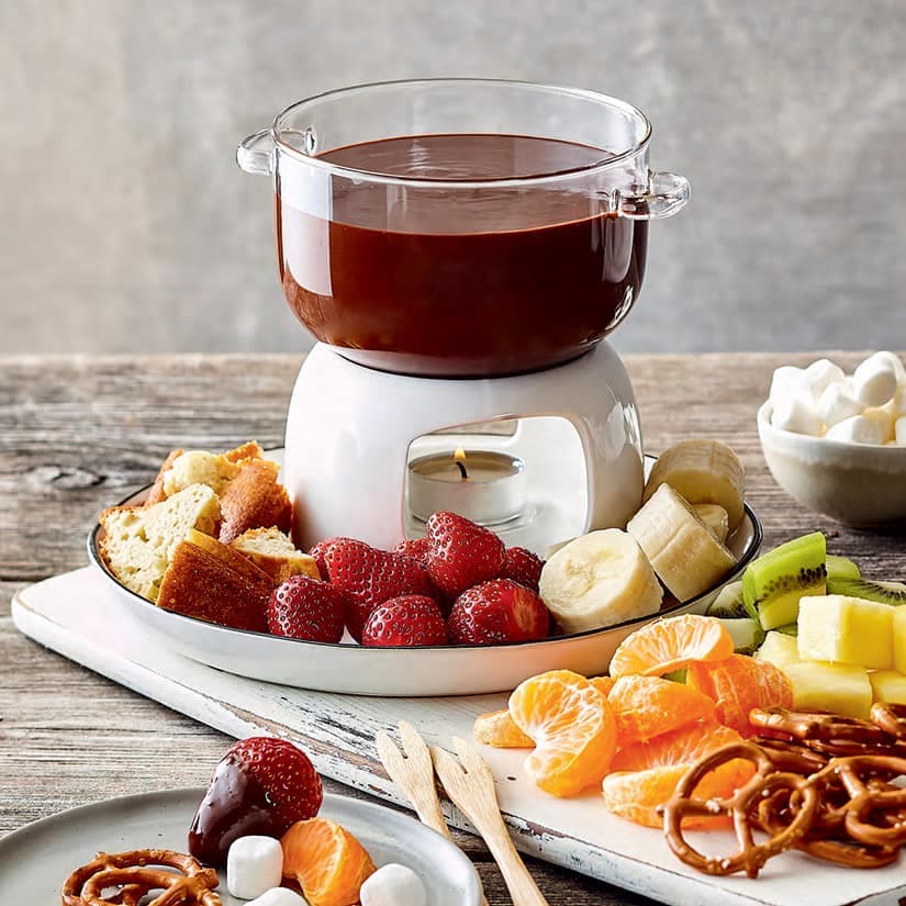 2. Verser la préparation de chocolat dans un caquelon à fondue et régler le réchaud à feu doux. Déguster aussitôt en y plongeant les ingrédients voulus.