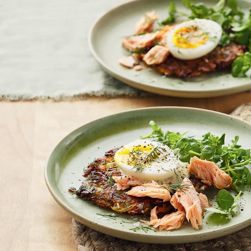 Galettes de pommes de terre et poireaux, œufs mollets et saumon fumé