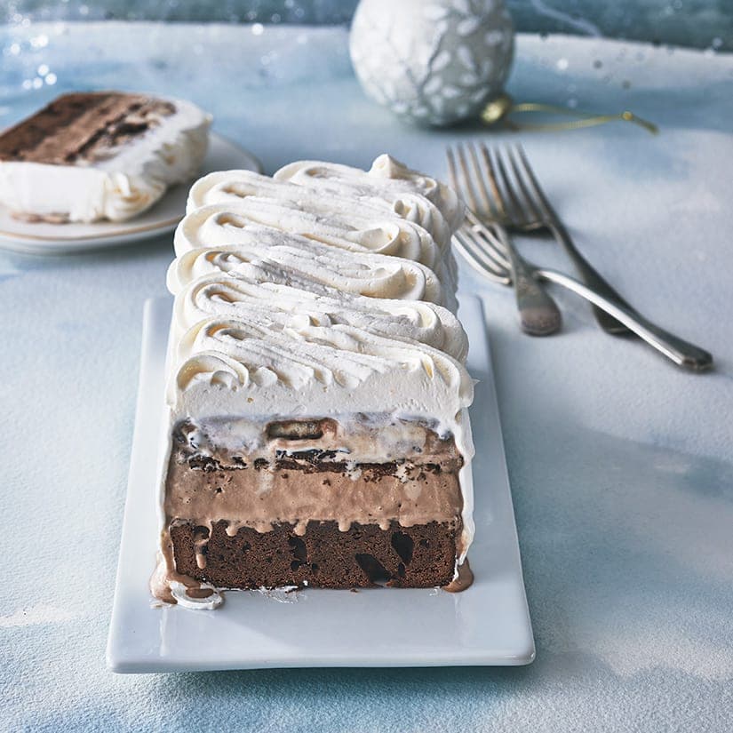 - Sortir le gâteau du congélateur et saisir la pellicule plastique pour le démouler. Renverser le gâteau sur une assiette de service et retirer la pellicule plastique. Recouvrir le gâteau de la crème fouettée, en lissant le dessus et les côtés à l'aide d'une spatule. Si désiré, mettre le reste de la crème fouettée dans une poche à pâtisserie (munie d'une douille large, ronde ou cannelée) et former des pics ou des zig-zags sur le dessus du gâteau. Retourner le gâteau au congélateur, directement dans son assiette et sans couvrir, pendant au moins 2 heures avant de couper en tranches et de servir. (Les parts restantes du gâteau assemblé se conservent au congélateur jusqu'à 1 semaine, emballées de pellicule plastique.)