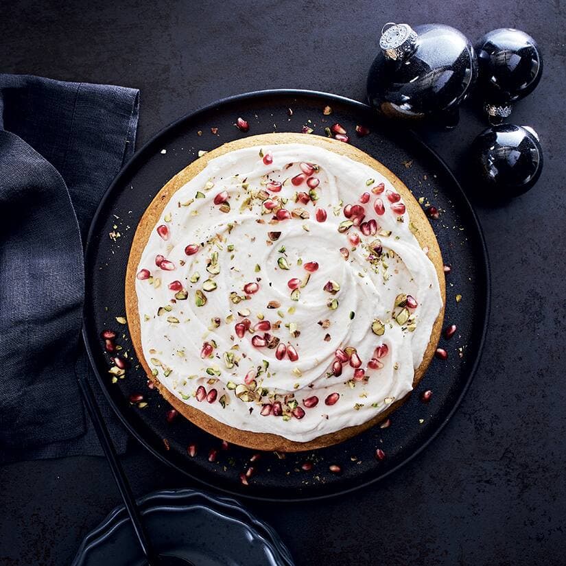 - À l'aide du batteur électrique, mélanger le labneh (ou le fromage à la crème) et le beurre dans un grand bol, à vitesse élevée, pendant environ 2 minutes. Ajouter le sucre, 1 t/250 ml à la fois, en mélangeant à vitesse moyenne de 45 secondes à 1 minute entre chaque addition. Ajouter l'extrait de vanille et mélanger de nouveau jusqu'à consistance homogène. Glacer le gâteau à l'aide d'une spatule, en essayant d'obtenir une épaisseur d'environ 3/4 po/2 cm. Décorer d'arilles de grenade et de pistaches concassées. (Le gâteau peut être préparé un jour d'avance et conservé au réfrigérateur. Le sortir environ 1 heure avant de servir. Couper en parts d'avance pour faciliter le service lors du potluck. Les parts de gâteau restantes se conservent jusqu'à 2 jours dans un contenant hermétique au réfrigérateur et jusqu'à 2 mois au congélateur.)