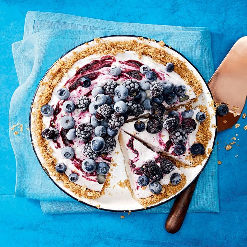 - Dans un autre grand bol, mettre la crème glacée ramollie. À l'aide d'une spatule, incorporer la préparation crémeuse à la crème glacée. Étendre le mélange dans la croûte réservée et lisser le dessus. Arroser de la sauce aux fruits réservée et passer la pointe d'un couteau dans la garniture de manière à créer un effet marbré. Couvrir d'une pellicule de plastique et congeler 6 heures ou jusqu'à ce que la crème glacée soit ferme. (Le gâteau au fromage glacé se conservera jusqu'à 7 jours au congélateur.)