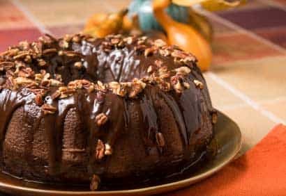 - Déposer la grille avec le gâteau sur une plaque de cuisson. À l'aide d'une grosse cuillère, arroser le dessus du gâteau de la sauce au chocolat (au besoin, récupérer la sauce qui s'accumule sur la plaque et la verser sur le gâteau). Parsemer des noix, si désiré.