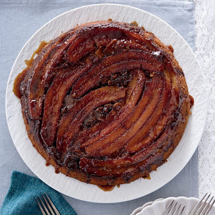 - Mettre une assiette de service sur le gâteau et le démouler en retournant le poêlon (au besoin, replacer les fruits sur la pâte).