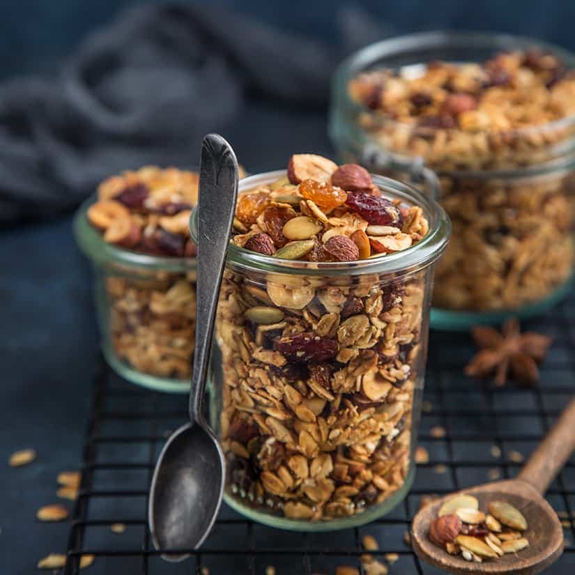1. Dans un grand bol, mélanger les flocons d'avoine, les graines de tournesol, les graines de citrouille, les graines de sésame, les olives noires, les tomates séchées, l'huile d'olive, la moutarde de Dijon, le sirop d'érable, le sel de mer, le thym et le piment de Cayenne. Étendre le mélange sur une plaque de cuisson tapissée de papier parchemin. Cuire au centre du four préchauffé à 300 °F (150 °C) pendant 45 minutes ou jusqu'à ce que le granola soit doré (remuer à mi-cuisson). Laisser refroidir complètement. (Le granola salé se conservera jusqu'à 3 semaines dans un contenant hermétique à la température ambiante et jusqu'à 3 mois au congélateur.)