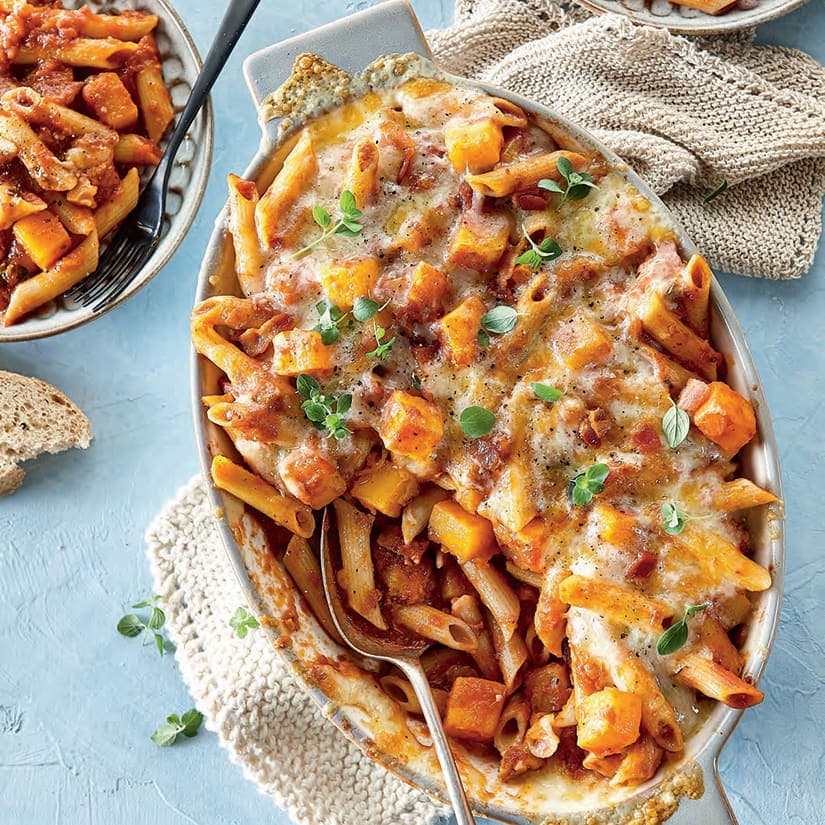 Gratin de pennes à la courge, au bacon et au cheddar