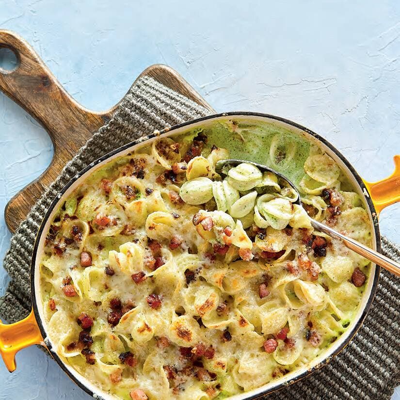 Gratin d’orecchiettes à la crème de rapini et à la pancetta