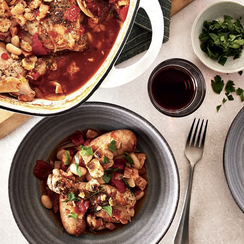- Dans une grande cocotte allant au four, faire revenir le bacon à feu moyen pendant 5 minutes ou jusqu'à ce qu'il devienne croustillant. Réserver le bacon dans une assiette sur du papier absorbant. Conserver 2 c. à soupe (30 ml) de gras dans la cocotte et jeter le reste. Toujours à feu moyen, faire revenir l'oignon de 3 à 4 minutes ou jusqu'à ce qu'il soit translucide. Ajouter l'ail et faire revenir 2 minutes de plus. Verser les haricots blancs, les tomates, le bouillon et la pâte de tomates. Remettre le bacon cuit dans la cocotte, et bien mélanger. Ajouter les morceaux de cuisse de poulet (avec le gras et le jus de cuisson, s'il y a lieu), les saucisses entières et les épices, saler et poivrer. À feu moyen, en remuant délicatement de temps à autre, laisser mijoter à découvert pendant 15 minutes ou jusqu'à ce que les saucisses soient cuites.