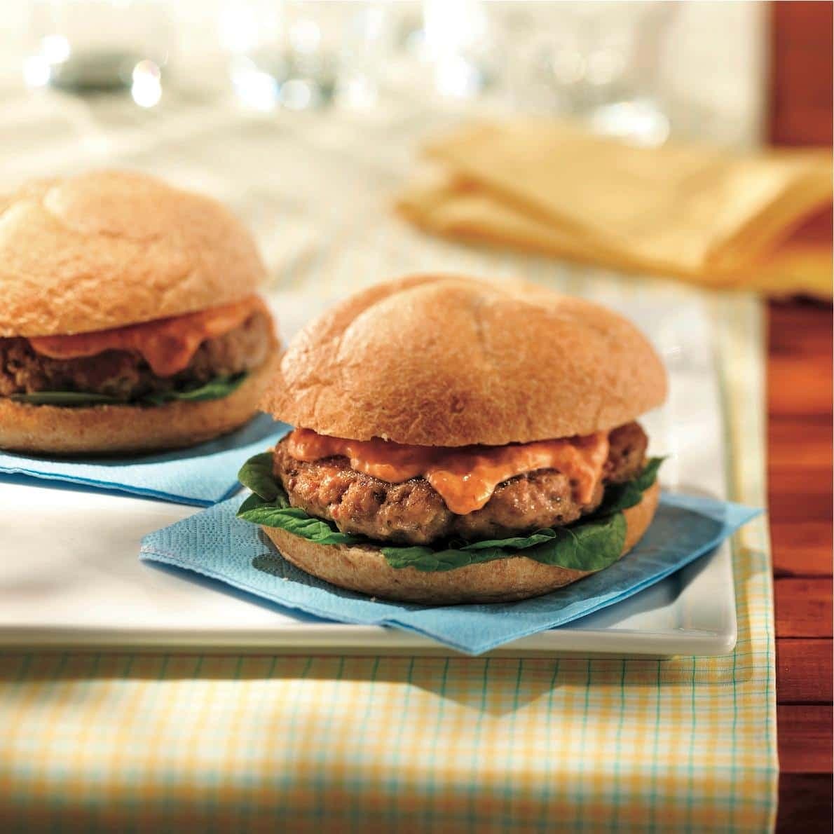 - Si désiré, mettre les pains sur la grille du barbecue et cuire pendant 2 minutes ou jusqu'à ce qu'ils soient dorés. Étendre la mayonnaise au poivron grillé à l'intérieur des pains et ajouter les pâtés d'agneau et quelques petites feuilles d'épinards.