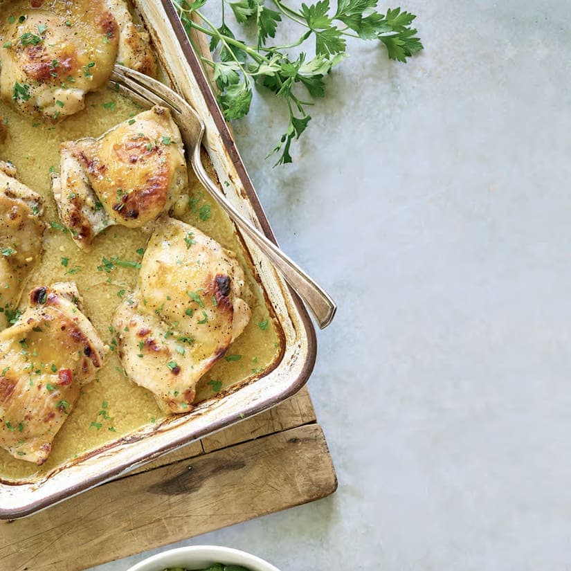 - Déposer le poulet dans un plat de cuisson et badigeonner de la marinade. Verser le bouillon autour des morceaux de poulet. Cuire au four 20 minutes (passer sous le gril au cours des dernières minutes de cuisson, si désiré). Garnir de persil frais et servir avec la salade de concombres épicée.