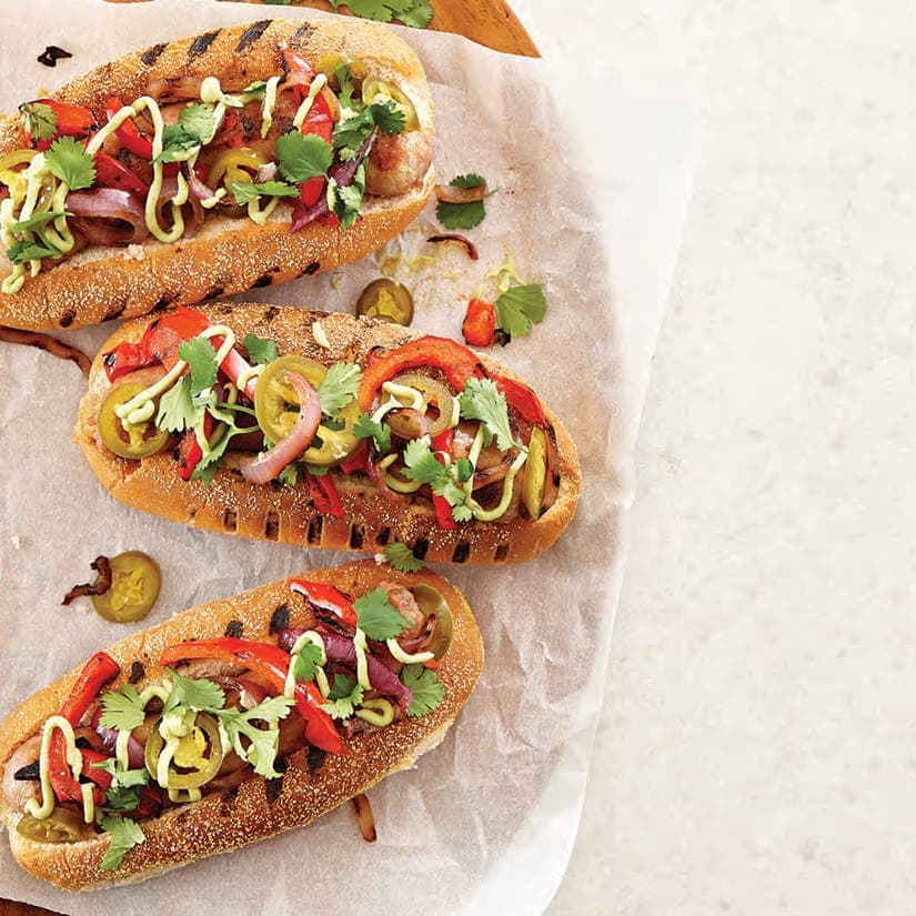 - Mettre une saucisse dans chaque pain. Garnir des poivrons, des oignons et de la sauce guacamole. Parsemer de coriandre et de piments marinés, si désiré.