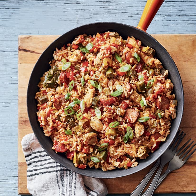 - Dans une grande casserole à fond épais ou une cocotte munie d'un couvercle, chauffer l'huile d'olive à feu moyen, puis faire revenir l'oignon et le céleri, en remuant de temps à autre, de 2 à 3 minutes ou jusqu'à ce qu'ils soient légèrement ramollis. Ajouter le poulet et la saucisse en remuant constamment. Faire revenir de 4 à 5 minutes ou jusqu'à ce que le poulet ne soit plus rosé. Ajouter les poivrons et l'ail et continuer à remuer pendant 2 minutes.