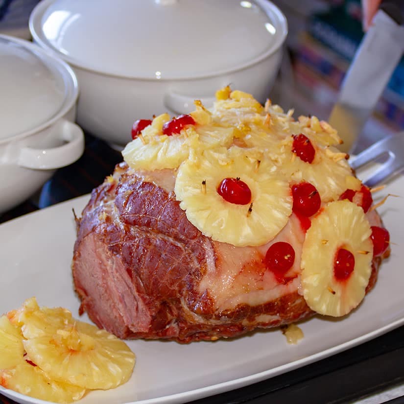 1. Dans un poêlon, chauffer le beurre à feu moyen. Ajouter les tranches d'ananas et les faire dorer. Au moment de servir, garnir le jambon des tranches d'ananas et des cerises et napper de la sauce. Couper en tranches.