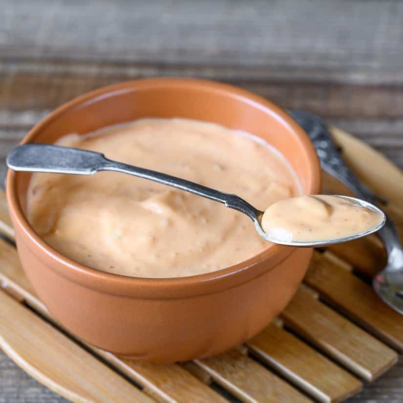 - Dans un petit bol, mélanger la mayonnaise, le ketchup, les cornichons, la moutarde, la sauce Worcestershire et le sel. (La sauce se conservera jusqu'à 5 jours au réfrigérateur.)