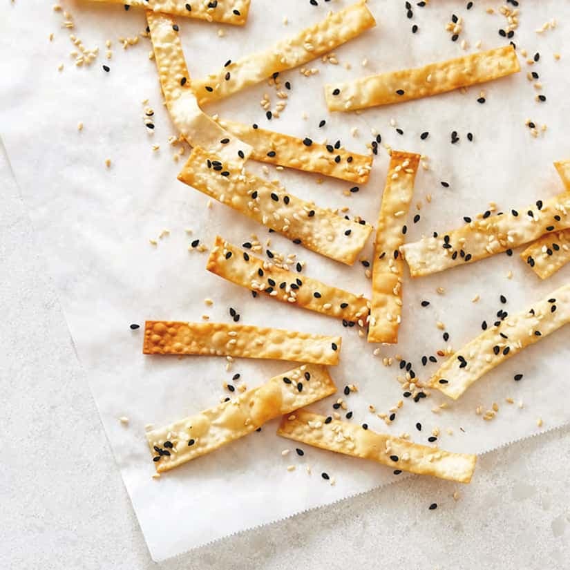 - Sur une plaque de cuisson légèrement huilée, étendre les lanières de wonton et les parsemer de graines de sésame.