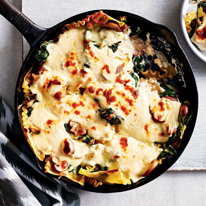 - Dans un grand poêlon en fonte légèrement huilé, étendre 1/2 t (125 ml) de la sauce au fromage. Couvrir de 3 lasagnes (couper les extrémités, au besoin), puis de la moitié du mélange de champignons et d'épinards réservé. Étendre la moitié du reste de la sauce sur le dessus, puis couvrir du reste des lasagnes, en les plaçant perpendiculairement aux lasagnes du fond. Couvrir du reste du mélange de champignons et du reste de la sauce. Parsemer du reste du mozzarella. Cuire au four préchauffé à 425 °F (220 °C) pendant 4 minutes. Poursuivre la cuisson sous le gril pendant 2 minutes ou jusqu'à ce que le dessus de la lasagne ait doré.