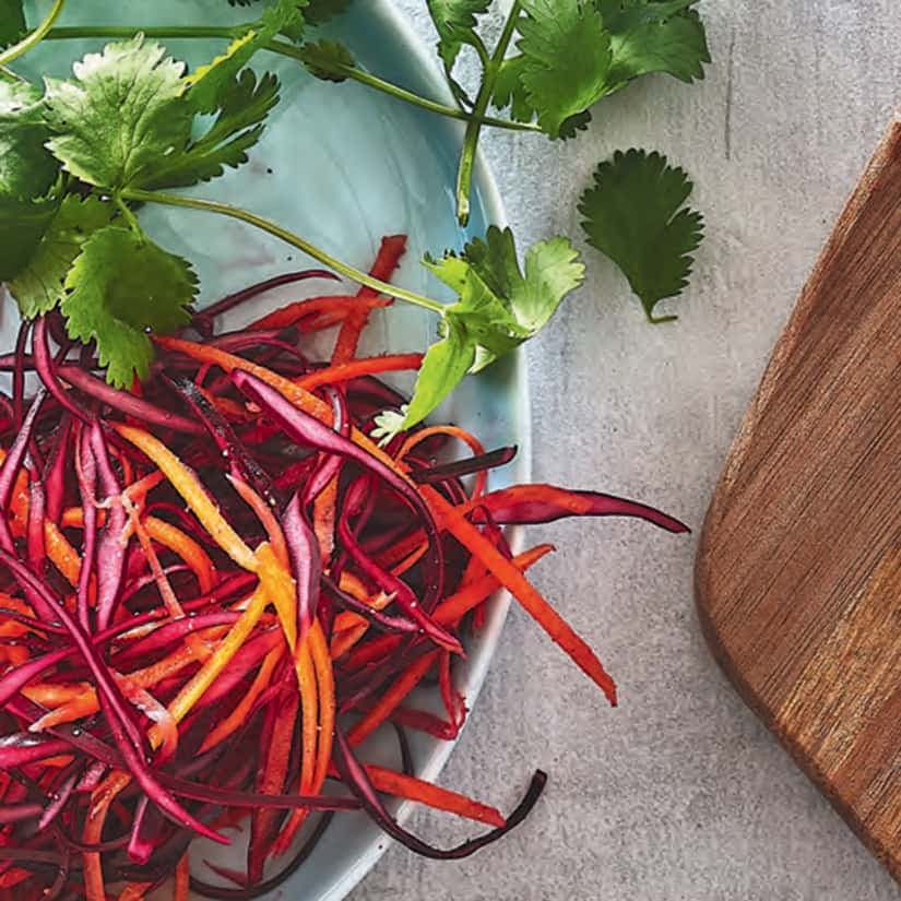 1. Dans un bol, mélanger le chou rouge et les carottes, le jus de lime, le cumin et la coriandre.
