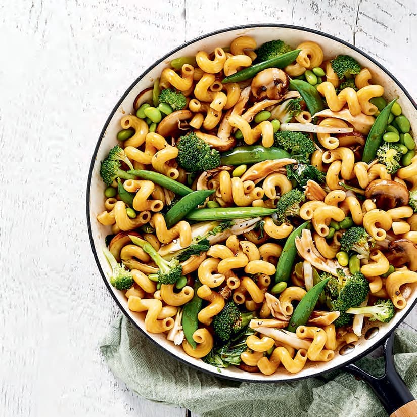 2. Entre-temps dans un poêlon, chauffer l'huile à feu moyen. Ajouter l'oignon, le gingembre, l'ail et le céleri, et cuire 10 minutes en brassant. Ajouter le brocoli, les pois gourmands, les pois mange-tout et les édamames, et poursuivre la cuisson 7 minutes. Ajouter le bok choy et les champignons, et poursuivre la cuisson 5 minutes. Ajouter le poulet et les pâtes réservées, puis bien mélanger.