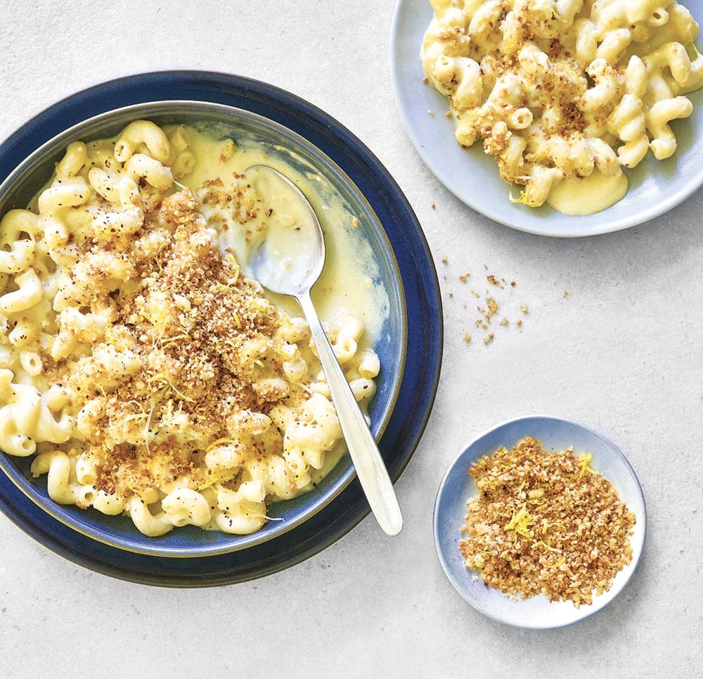 Remettre la sauce dans la poêle et ajouter les pâtes cuites ainsi que les fromages. Mélanger doucement jusqu’à ce que le fromage soit fondu. Garnir de chapelure à l’ail, si désiré.