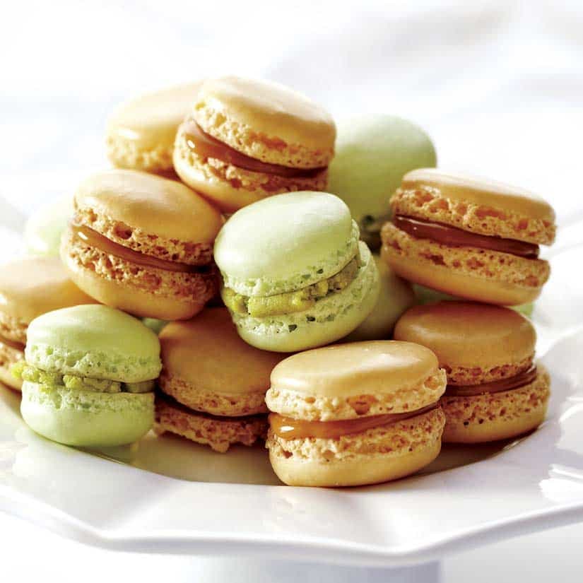 - Étendre environ 1/2 c. à thé (2 ml) de la garniture aux pistaches sur le côté plat de la moitié des meringues refroidies. Couvrir du reste des meringues, le côté plat dessous. (Vous pouvez préparer les macarons à l'avance et les mettre dans un contenant hermétique. Ils se conserveront jusqu'au lendemain à la température ambiante.)