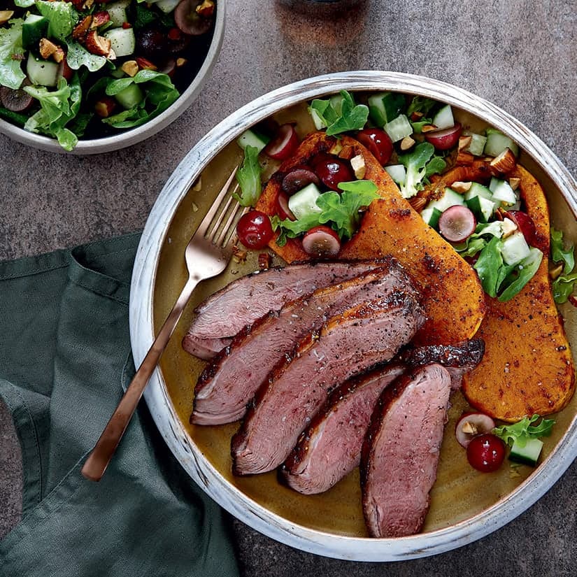 - À l'aide d'un couteau bien aiguisé, faire des incisions en quadrillé dans le gras des magrets (ne pas couper la chair). Saler et poivrer le canard. Déposer les magrets dans un poêlon en fonte, le côté gras vers le bas. Cuire à feu moyen-vif, en arrosant le canard du liquide de cuisson, 10 minutes ou jusqu'à ce que le gras des magrets soit bien doré. Retourner les magrets et ajouter l'ail, le thym et les baies dans le poêlon. Poursuivre la cuisson de 4 à 5 minutes ou jusqu'à ce que le dessous des magrets soit bien doré. Retirer du feu et réserver dans une assiette (jeter les épices).