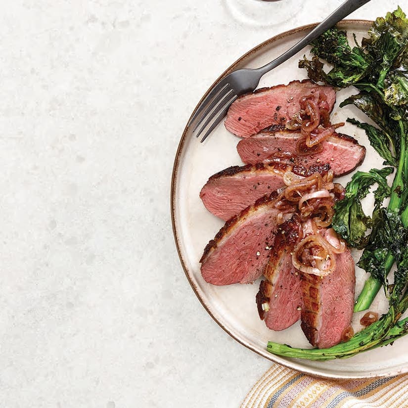 - Mettre les magrets sur une planche à découper, puis les couper en tranches dans le sens inverse des fibres de la viande. Servir avec les échalotes. Accompagner de rapinis rôtis ou de légumes verts, si désiré.