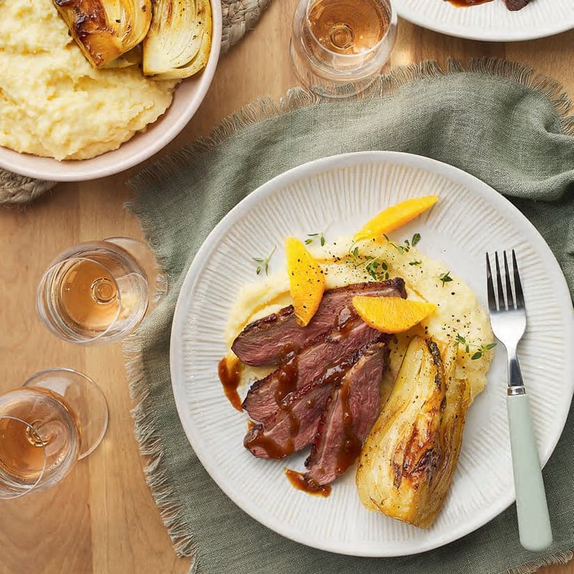 - À l'aide d'un couteau bien aiguisé, faire des incisions en quadrillé dans le gras des magrets (ne pas couper la chair). Saler et poivrer. Chauffer un poêlon à feu moyen, puis y déposer les magrets, le côté gras vers le bas. Cuire 3 minutes, en arrosant le canard du liquide de cuisson. Retourner les magrets. Ajouter le beurre, l'ail et le thym, et poursuivre la cuisson 2 minutes. Retourner de nouveau les magrets, le côté gras vers le bas, et cuire au four préchauffé 350 °F (180 °C) pendant 10 minutes.