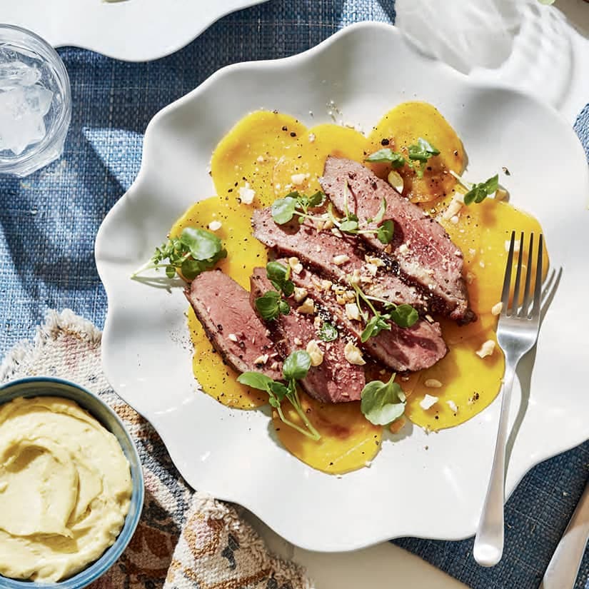 - Répartir les tranches de betteraves au centre des assiettes; recouvrir de la vinaigrette. Disposer les tranches de magret sur le dessus, puis déposer 1 c. à soupe comble de faux-mage de cajou. Garnir de quelques feuilles de cresson (ou d'autres verdures) et des noix de cajou concassées.