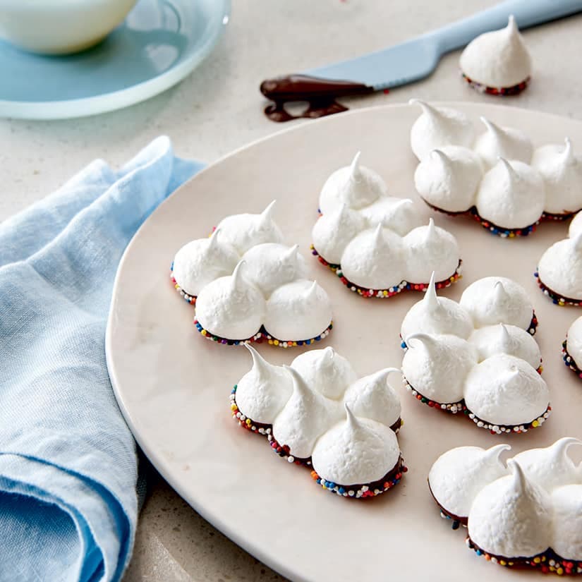 - Sur 2 plaques à biscuits tapissées de papier parchemin, à l'aide d'une poche à douille munie d'un embout rond de 1/2 po (1 cm), former des nuages de meringue d'environ 2 1/2 po (6 cm) de longueur. Pour ce faire, réaliser 3 rosettes de meringue côte à côte, puis 2 rosettes juste au- dessus. Mettre une plaque dans le tiers supérieur du four préchauffé à 200 °F (100 °C) et l'autre dans le tiers inférieur. Cuire 1 heure 30 minutes ou jusqu'à ce que les meringues soient sèches et fermes. Éteindre le four et y laisser reposer les meringues pendant 1 heure. Déposer les plaques sur des grilles et laisser refroidir complètement.