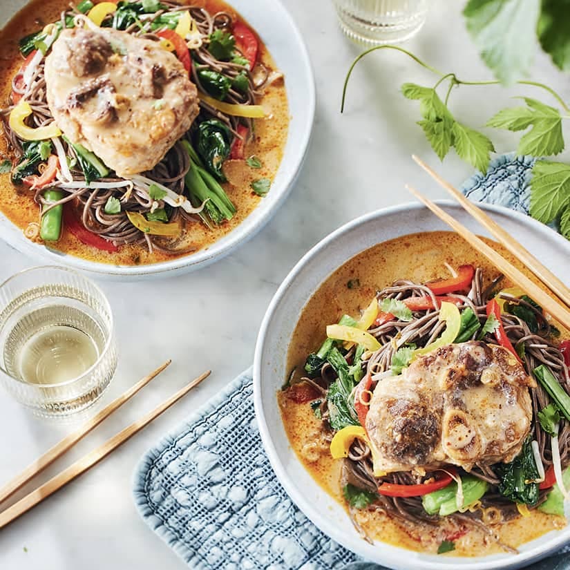 2. Dans la cocotte, faire revenir la citronnelle, le galanga (ou le gingembre), les feuilles de lime kaffir, si désiré, le piment thaï et la pâte de cari de 2 à 3 minutes à feu doux. Ajouter la sauce de poisson et le sucre, et poursuivre la cuisson 1 minute. Verser le bouillon et le lait de coco dans la cocotte, puis mélanger. Remettre les jarrets de porc dans la cocotte. Couvrir et enfourner. Laisser mijoter pendant 3 heures. Servir sur les nouilles soba aux légumes avec une généreuse portion de bouillon.