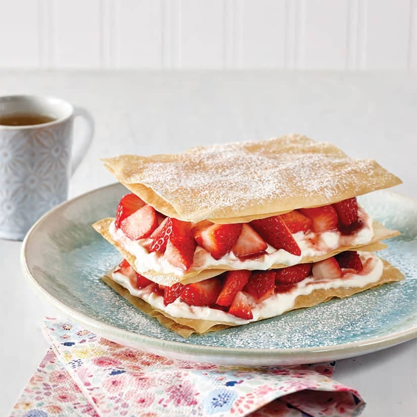 - Au moment de servir, superposer 2 rectangles de pâte phyllo dans une assiette. À l'aide d'une spatule, étendre délicatement 2 c. à soupe (30 ml) de crème fouettée. Ajouter 1 c. à thé (5 ml) de confiture, puis passer la lame d'un couteau dans la crème de manière à créer un effet marbré. Garnir de 2 c. à soupe (30 ml) de fraises en laissant une bordure de 1/2 po (1 cm) sur le pourtour. Couvrir de 2 autres rectangles de pâte phyllo, d'une couche de crème et de confiture, puis d'une couche de fraises. Terminer avec 2 rectangles de pâte phyllo. Saupoudrer de sucre glace, si désiré. Procéder de la même manière avec le reste des ingrédients.