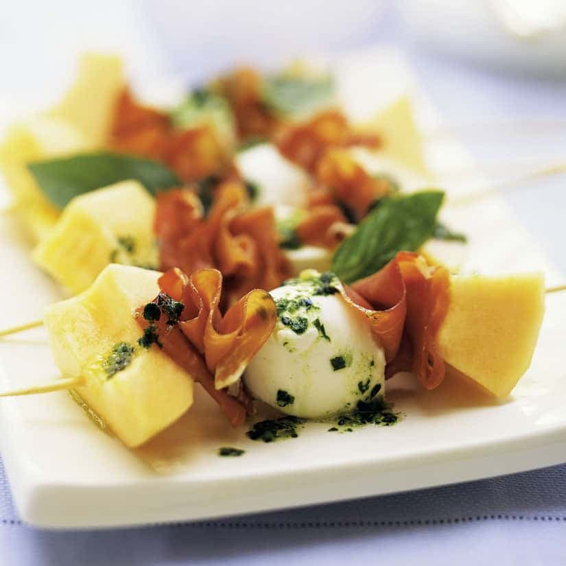 Mini-brochettes de cantaloup, bocconcinis et prosciutto